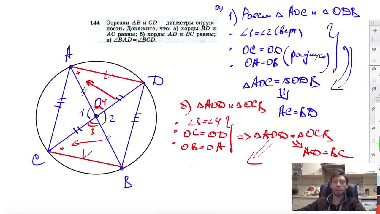 №144. Отрезки АВ и CD — диаметры окружности. Докажите, что: а) хорды BD и АС равны; б) хорды AD и ВС равны; в) ∠BAD =∠BCD. Поддержать канал рублём - 5469400944002125 (Сбербанк) Мой второй канал для подготовки к ЕГЭ и ОГЭ - https://www.youtube.com/ЕвгенийСумин Инстаграм - https://www.instagram.com/EGE_OGE.math Личный инстаграм - https://www.instagram.com/ee_sumin VK - https://vk.com/evgeniysumin FB - https://www.facebook.com/EvgeniySumin