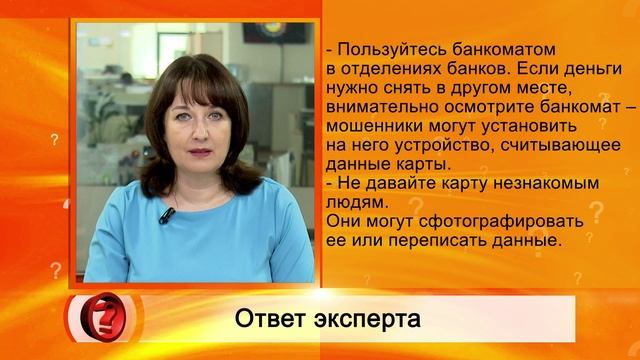 ЭКСПЕРТ: Елена Кирсанова - начальник экономического отдела Отделения Банка России по РТ ВОПРОС: Как я могу защитить свою банковскую карту от мошенников? ОТВЕТ: - Никогда и никому не раскрывайте данные карты: номер, имя и фамилию владельца, срок действия, код проверки подлинности (три цифры на обратной стороне), ПИН-код и код из СМС, который высылается для подтверждения покупки на каком-либо сайте. - Не пишите ПИН-код на карте и не храните его рядом с ней. - Пользуйтесь банкоматом в отделениях банков. Если деньги нужно снять в другом месте, внимательно осмотрите банкомат – мошенники могут установить на него устройство, считывающее данные карты. - Не давайте карту незнакомым людям. Они могут сфотографировать ее или переписать данные. - Подключите мобильный банк и СМС-уведомления. Информация обо всех операциях будет сразу же приходить на мобильный телефон – так вы сможете отследить мошеннические операции. - Для повседневных трат и покупок в интернете закажите отдельную карту и храните на ней небольшую сумму денег. - Если же все-таки злоумышленники получили доступ к карте – сразу позвоните в банк и заблокируйте карту.