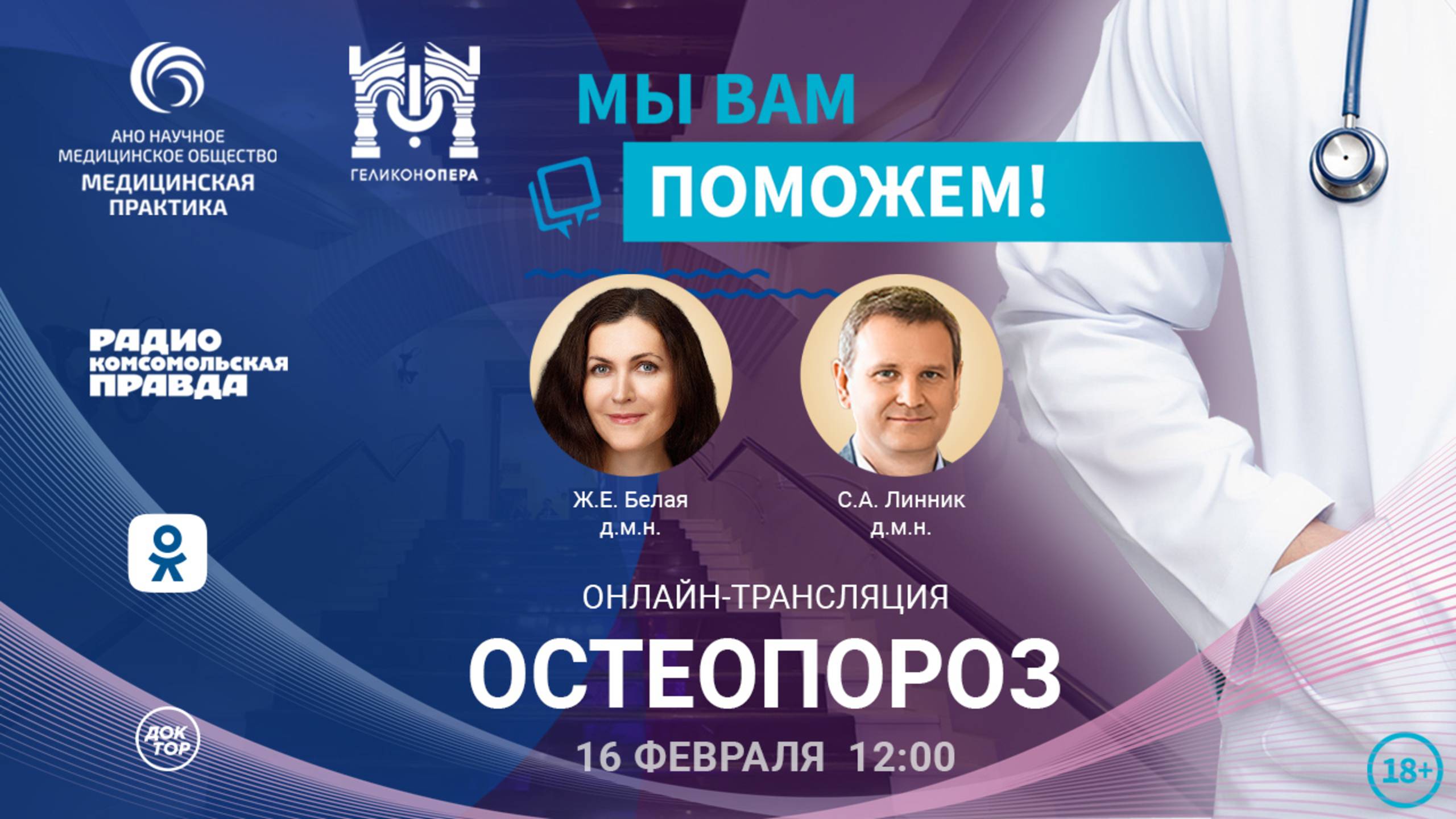 16 февраля 2025 г. в 12:00 (время московское) состоялся прямой эфир проекта «Мы вам поможем!», посвящённый остеопорозу. Остеопороз часто остаётся незамеченным, несмотря на серьёзные последствия. Эта болезнь ослабляет кости, делая их уязвимыми к переломам даже при минимальных нагрузках. Но многие ли из нас осознают реальный риск столкнуться с этой проблемой? Согласно статистике, 80% пациентов, перенесших переломы вследствие остеопороза, никогда не проходили обследование и лечение по поводу этого заболевания. Остеопороз затрагивает миллионы людей: каждая третья женщина и каждый пятый мужчина старше 50 лет могут столкнуться с переломами, вызванными остеопорозом. Это заболевание приводит к большему числу дней госпитализации, чем рак молочной железы, стенокардия или диабет. Более того, смертность от последствий остеопороза выше, чем у некоторых видов рака, что делает его одним из самых опасных угроз здоровью. Мы вышли в прямой эфир со специальным выпуском проекта «Мы вам поможем!», чтобы ответить на ваши вопросы: • Что такое остеопороз? • Кто в группе риска? • Какие симптомы у остеопороза? • Как диагностируют остеопороз? • Как профилактировать и лечить остеопороз? Ведущие эксперты России поделились этой и другой важной информацией в прямом эфире проекта "Мы вам поможем!", который проводится Научным обществом "Медицинская практика", театром "Геликон-опера" и радио "Комсомольская правда". На вопросы зрителей отвечала Жанна Евгеньевна Белая - д.м.н., руководитель центра остеопороза, заведующая отделением остеопороза и остеопатии ГНЦ РФ ФГБУ «НМИЦ эндокринологии» Минздрава России. Как всегда, беседу модерировал генеральный директор Научного общества «Медицинская практика», д.м.н. Сергей Александрович Линник. «Мы вам поможем!» – так однажды решили создатели уникального онлайн-проекта, возникшего по инициативе научного общества «Медицинская практика» и Московского музыкального театра «Геликон-опера». Девиз «Медицинской практики»: «Результативное лечение через мировой опыт и обмен практическими знаниями». Кредо «Геликона»: «Для человека, влюбленного в жизнь и в искусство, смертельного приговора не существует».