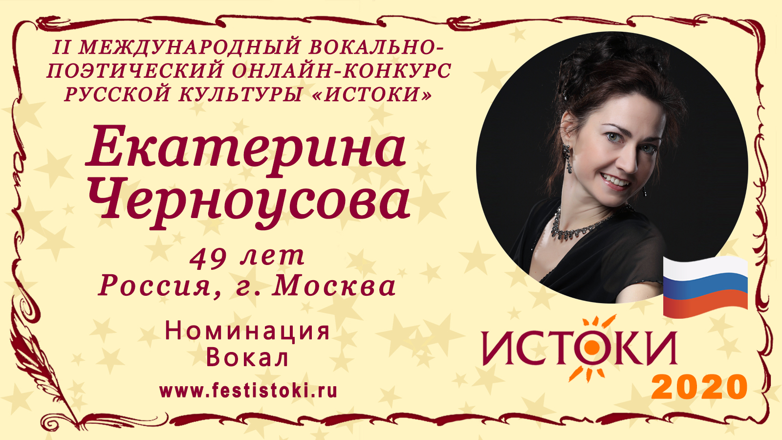 Лауреат III степени II Международного вокально-поэтического онлайн-конкурса русской культуры «Истоки». Номинация - Вокал. Народная песня "Ах, ты душечка". Сайт: www.festistoki.ru / www.festistoki.com E-mail: festistoki@mail.ru