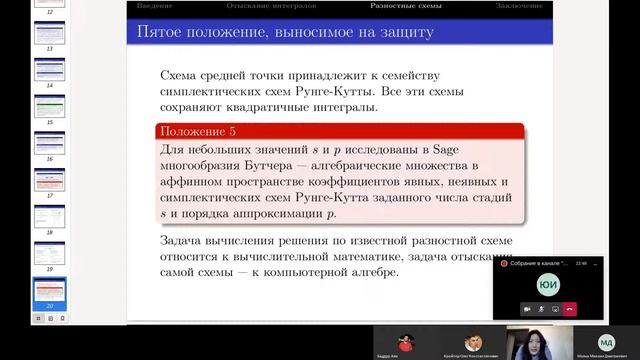 Yu Ying (余英) Numerical-analytical Methods in Mathematical Modeling Problems We consider methods for searching algebraic invariants of dynamical systems and methods for constructing conservative finite-difference schemes that preserve all found quadratic invariants. In the first chapter, the problem of searching algebraic invariants is presented, the difficulties encountered in solving it are indicated, and the Lagutinski method of searching algebraic invariants and Darboux polynomials is described. In the second chapter, the Lagutinski package under computer algebra system Sage is constructed and implemented which includes not only the functions of calculation of Lagutinski determinants, partial and general integrals for differential rings, but also a series of functions to speed up the calculations. At the same time, new necessary conditions for the existence of the rational integral are given. In the third chapter, the construction of mimetic difference schemes for dynamical systems with quadratic invariants and a comparison of the properties of exact and approximate solutions found by these schemes are discussed. Юй Ин Численно-аналитические методы в задачах математического моделирования Рассматривается методы отыскания алгебраических интегралов движения динамических систем и конструирования разностных схем, сохраняющих все найденные алгебраические интегралы. В первой главе сформулирована задача об отыскании алгебраический интегралов, указаны трудности, возникающие при ее решении, описан метод Лагутинского отыскания интегралов и многочленов Дарбу. Во второй главе представлен пакет Lagutinski для системы компьютерной алгебры Sage, в котором реализованы не только вычисление определителей Лагутинского, частных и общих интегралов дифференциальных колец, но и ряд функций, использование которых ускоряет вычисления, а также проверка новых необходимых условий существования рационального интеграла. Третья глава диссертации была посвящена конструированию миметических (консервативных) разностных схем для динамических систем, обладающих законами сохранения, и сравнению свойств точных и приближенных решений, найденных по этим схемам. https://events.rudn.ru/event/80/