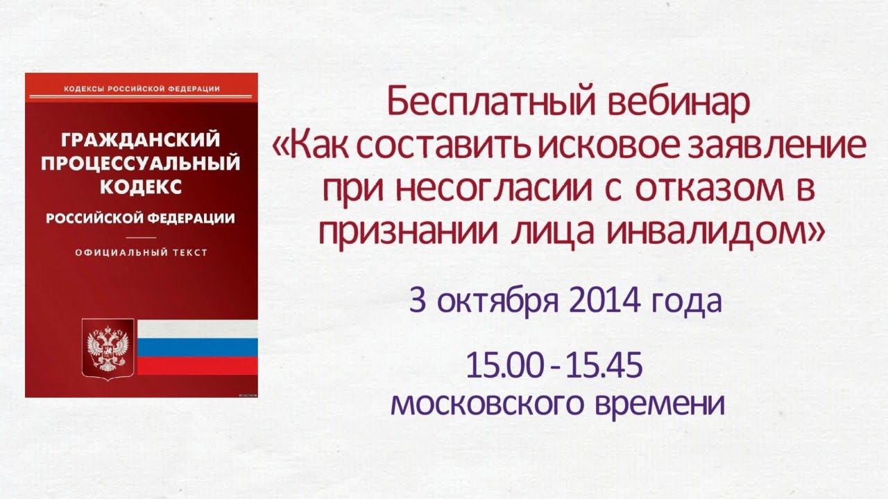 Бесплатный вебинар Центра медицинского права «Как составить исковое заявление при несогласии с отказом в признании лица инвалидом» Дата: 2.10.2014 г. с 15 до 15.45 часов московского времени Программа вебинара 1. Исковое заявление – процессуальная форма обращения в суд 2. Подсудность 3. Данные сторон 4. Что нарушено? 5. Обстоятельства и доказательства 6. Прилагаемые документы Перейти к регистрации http://pravo-med.ru/about/calendar/registration.php