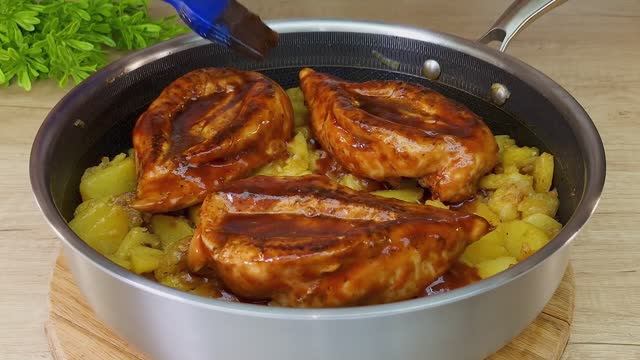 Чтобы куриные грудки были сочные и нежные готовлю их только так! ВКУСНО! Ингредиенты: 3 куриные грудки; соль, черный перец; паприка; 4-5 ст.л. сливочного масла; орегано; немного растительного масла; картофель; 1 луковица; 1 ст.л. меда; 3 ст.л. томатной пасты; 3 ст.л. соевого соуса; 2-3 зубчика чеснока; Приятного аппетита! Спасибо, что смотрите и комментируете мои видео! Спасибо что, смотрите👀 мои видео! Если Вам не сложно, подпишитесь🔊 на мой канал. Если Вам понравилось видео, поставьте 👍 💘,сделайте репост;) Буду рад любому донату💲 на корм моему котику Василию 🐱😇🌹 Вам мелочь, а нам приятно.🌹 вкусная кухня#рецепт#готовим вкусный ужин#вкусно каждый день#любимые рецепты# любимое блюдо моего мужа#быстрый и легкий ужин с курицей#кулинарный рецепт#креативный рецепт#рецепт с курицей#быстрый обед из курицы#рецепт домашней курицы#вкусный обед#домашняя еда.