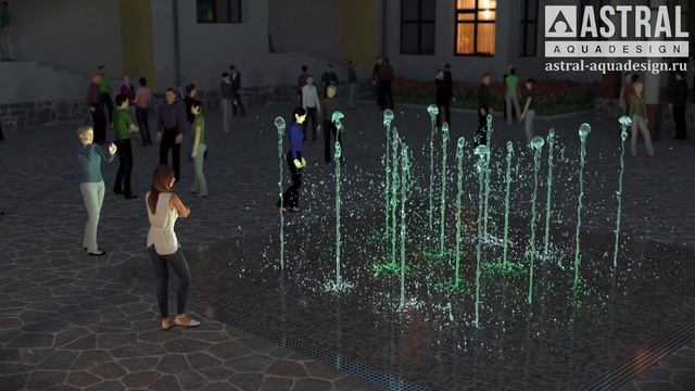 Плоскостной пешеходный фонтан "Мой район" из 16 вертикальных струй высотой 2,0 м, размер 6,4х6,4 м