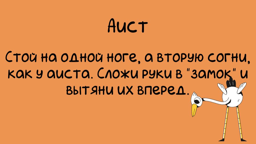 Упражнение "АИСТ". · Цель для развития: Статическое равновесие, концентрация, укрепление мышц кора. · Как выполнять ребёнку: «Встань прямо. Подними одну ногу, согни её в колене. Вытяни две руки вперед, сложенные в замок. Стой, как аист, который высматривает лягушку! Спина прямая, грудь раскрыта». · На что обратить внимание маме: · Осанка: Следите, чтобы ребёнок не сутулился и не заваливался вперёд. Вытянутые вперёд руки помогает балансировать. · Колено: Поднятое колено смотрит вперед, а не в сторону. · Упрощение: Если сложно держать равновесие, можно сначала делать у опоры. · Игровой момент: «Аист замер в ожидании добычи. Замри!» Можно устроить конкурс на самого стойкого аиста.