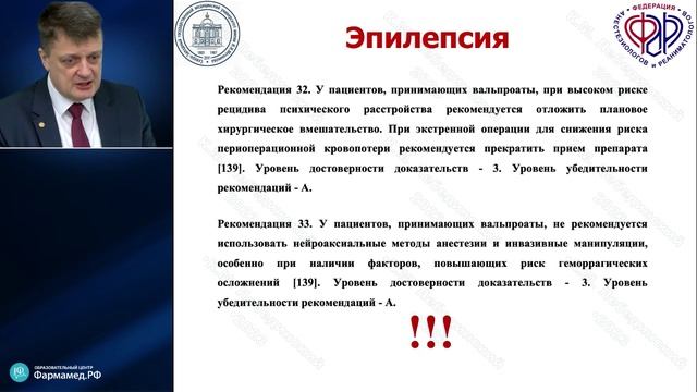 Видеозапись онлайн-семинара для врачей "Периоперационное ведение пациентов с неврологическими и психическими заболеваниями" О семинаре: В ходе семинара на основе недавно пересмотренных методических рекомендаций Федерации анестезиологов и реаниматологов будут обсуждаться основные правила предоперационного обследования, подготовки, проведения анестезии и послеоперационной интенсивной терапии у пациентов, страдающих распространенными заболеваниями нервной системы и психической сферы. Особое внимание будет уделено наиболее часто встречающимся ситуациям (пароксизмальные состояния, паркинсонизм, состояние после ОНМК, болезнь Альцгеймера, шизофрения, биполярное расстройство) и практическому подходу к этой группе пациентов с позиций клинического здравого смысла. Докладчик: Константин Михайлович Лебединский Заведующий кафедрой анестезиологии и реаниматологии им. В.Л. Ваневского СЗГМУ им. И.И. Мечникова, Президент Общероссийской общественной организации «Федерация анестезиологов и реаниматологов» (ФАР), д.м.н., профессор Дата проведения: 06.02.23 в 20:00 мск Организатор: Образовательный центр Фармамед.РФ - один из крупнейших образовательных порталов в России. Бесплатные онлайн-семинары в программе НМО. Ссылка на видео: https://rutube.ru/video/private/882300a9da791c4669740a2074fecacb/?p=HGUpn52BBoPXkOLFp0FLyA Читайте актуальные новости медицины: https://obrfm.ru/news/ Канал Образовательного центра Фармамед.РФ: https://www.youtube.com/channel/UCJTFAPBD3dZ3PugMTcB5xqg Сайт Образовательного центра Фармамед.РФ : https://obrfm.ru Мы на Rutube: https://rutube.ru/channel/24964912/ Подпишитесь на нас ВКонтакте (здесь публикуются ежедневные анонсы мероприятий): https://vk.com/obrfm