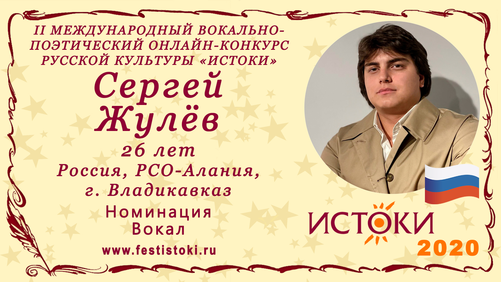 Участник II Международного вокально-поэтического онлайн-конкурса русской культуры «Истоки». Номинация - Вокал. Песня "Нежность" Музыка А. Пахмутова, стихи С. Гребенников, Н. Добронравов. Сайт: www.festistoki.ru / www.festistoki.com E-mail: festistoki@mail.ru