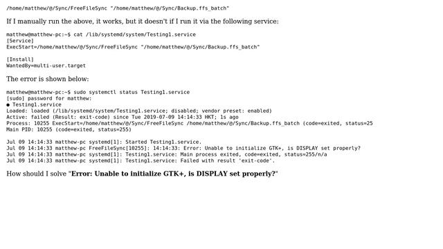 System service "Error: Unable to initialize GTK+, is DISPLAY set properly?"
