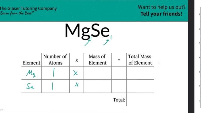 Calculate the molar mass of the following: MgSe (Magnesium Selenide) SUBSCRIBE if you'd like to help us out! https://www.youtube.com/channel/UC2C34WdYMOm47PkWovvzLpw?sub_confirmation=1 Want us as your private tutor? Get started with your FREE initial assessment! https://glasertutoring.com/contact/ #MolarMass #MassChemistry #Chemistry