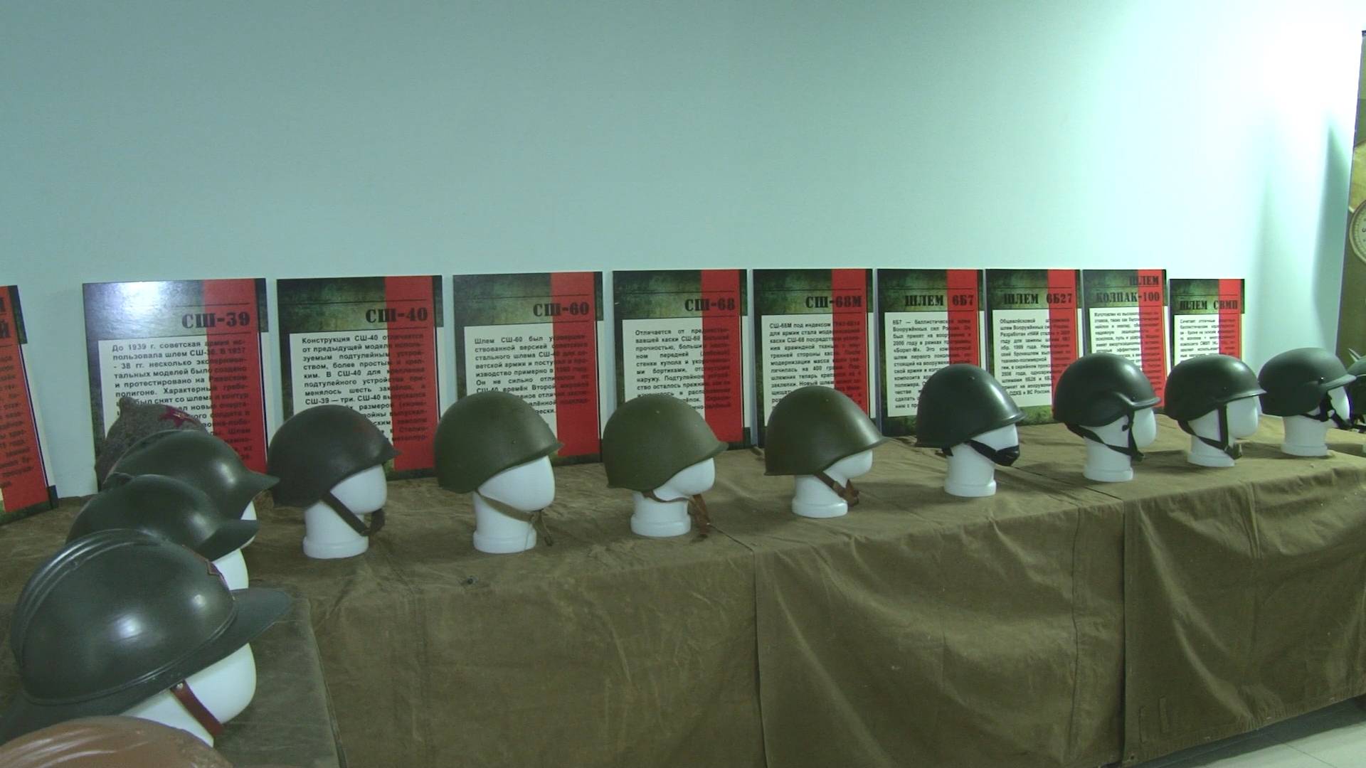 Представленные на экспозиции экземпляры дают возможность наглядно проследить историю и эволюцию защитного головного убора от времён Первой мировой войны до наших дней.