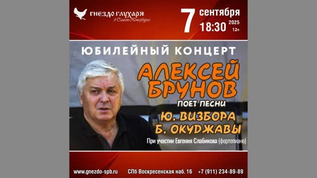 Юбилейный вечер. Алексей Брунов поёт песни Булата Окуджавы и Юрия Визбора при участии Евгения Слабикова. 7 сентября 2025 г. Бард-кафе «Гнездо глухаря». Санкт-Петербург, Воскресенская наб., д. 16. Видеозапись - Полина Звягинцева. 1-е отделение 0:00:08 Евгений Слабиков – вступление 0:02:47 Алексей Брунов – вступление 0:05:05 В ГОРОДСКОМ САДУ («Круглы у радости глаза») (ст.) (Б. Окуджава) 0:06:58 МУЗЫКАНТ («Музыкант играл на скрипке…») (Б. Окуджава) 0:10:15 «Время идёт хоть шути – не шути…» (Б. Окуджава) 0:13:17 «Я вновь повстречался с Надеждой…» (Б. Окуджава) 0:16:54 «Шарманка старая крутилась… (ст.) (Б. Окуджава) 0:17:54 ВИЛКОВСКАЯ ФАНТАЗИЯ («Как бы мне сейчас хотелось в Вилкове вновь очутиться…») (Б. Окуджава) 0:22:55 ПЕСНЯ КАВАЛЕРГАРДА из к/ф «Звезда пленительного счастья» («Кавалергарда век недолог…») (муз. И. Шварца, ст. Б. Окуджавы) 0:27:46 ВТОРОЕ ПОСЛЕВОЕННОЕ ТАНГО («Всему времечко своё…») (муз. В. Иванова, ст. Б. Окуджавы) 0:32:40 «И когда удивительно близко…» (Б. Окуджава) 0:35:24 ДЕЖУРНЫЙ ПО АПРЕЛЮ («Ах, какие удивительные ночи…») (Б. Окуджава) 0:37:58 НОВОЕ УТРО («Не клонись-ка ты, головушка…») (Б. Окуджава) 0:40:55 ПЕСЕНКА О КОМСОМОЛЬСКОЙ БОГИНЕ («Я гляжу на фотокарточку…») (Б. Окуджава) 0:43:50 «Как случилось – не заметила сама…» (Б. Окуджава) 0:47:15 АРБАТСКИЙ РОМАНС («Арбатского романса старинное шитьё…») (Б. Окуджава) 0:51:59 СРЕТЕНСКИЙ ДВОР («А в тени снег лежит как гора…») (Ю. Визбор) 0:55:20 КОГДА ПРИДЁТ МОЙ ПАРОХОД («Мой дальний порт туманы стерегут…») (Ю. Визбор) 0:58:05 «А море серое всю ночь качается…» (Ю. Визбор) 1:00:29 «Обучаю играть на гитаре…» (Ю. Визбор) 1:02:58 «В Ялте ноябрь…» (Ю. Визбор) 1:06:57 «Здравствуй, здравствуй, я вернулся…» (Ю. Визбор) 1:09:13 «В то лето шли дожди…» (Ю. Визбор) 2-е отделение 1:12:15 Евгений Слабиков – вступление (АРБАТСКИЙ РОМАНС) (Б. Окуджава) 1:15:27 ПЕСЕНКА О ЛЁНЬКЕ КОРОЛЁВЕ («Во дворе, где каждый вечер всё играла радиола…») (Б. Окуджава) 1:18:19 ОЛОВЯННЫЙ СОЛДАТИК МОЕГО СЫНА («Земля гудит под сапогами…) (ст.) (Б. Окуджава) 1:19:33 «Ах, трубы медные гремят…» (Б. Окуджава) 1:20:44 Евгений Слабиков. ПЕСЕНКА О ПЕХОТЕ («Простите пехоте…») (Б. Окуджава) Алексей Брунов 1:23:13 ВСТАВАЙТЕ, ГРАФ («Вставайте, граф! Рассвет уже полощется…») (Ю. Визбор) 1:25:23 ЛЮСИ («Он поздно проснулся, нашёл сигарету…») (Ю. Визбор) 1:28:40 ДЕРЕВНЯ НОВЛЯНКИ («Давайте сюда коня!..») (Ю. Визбор) 1:31:45 РЕЧНОЙ ТРАМВАЙ («По самой длинной улице Москвы…») (Ю. Визбор) 1:35:27 «Мне твердят…» (Ю. Визбор) 1:38:20 ФЕВРАЛЬ («Ах, какая пропажа, пропала зима…») (Ю. Визбор) 1:41:40 «Передо мною горы и река…» (Ю. Визбор) 1:46:48 ЛЕДОВАЯ РАЗВЕДКА («Прощай, патруль! Мне больше не скрипеть…») (ст.) (Ю. Визбор) 1:48:22 СЕРЁГА САНИН («С моим Серёгой мы шагаем по Петровке…») (Ю. Визбор) 1:51:22 СОРОКАЛЕТЬЕ («Нас исполняет музыка по лицам…») (Ю. Визбор) 1:57:48 Я В ДОЛГУ ПЕРЕД ВАМИ («Снег над лагерем валит…») (Ю. Визбор) 2:02:07 РЕКА НЕГЛИНКА («Трактора стоят среди дороги…») (Ю. Визбор) 2:05:15 «Неистов и упрям, гори, огонь, гори…» (Б. Окуджава) 2:07:19 ПЕСНЯ («Не верю в Бога и судьбу. Молюсь прекрасному и высшему…») (Б. Окуджава) 2:08:21 ОТЪЕЗД. Владимиру Спивакову («С Моцартом мы уезжаем из Зальцбурга…») (Б. Окуджава) 2:12:50 «После дождичка небеса просторней…» (Б. Окуджава) 2:19:02 Евгений Слабиков – ПЕСЕНКА О МОЦАРТЕ (Б. Окуджава) Алексей Брунов 2:20:05 МОЛИТВА («Пока Земля ещё вертится…») (Б. Окуджава) 2:27:23 СОЮЗ ДРУЗЕЙ (СТАРИННАЯ СТУДЕНЧЕСКАЯ ПЕСНЯ) («Поднявший меч на наш союз…») (Б. Окуджава)