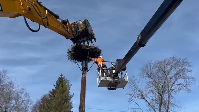 В Ленобласти перенесли гнездо аистов весом 200 килограммов с дерева, которое подлежало вырубке из-за асширения федеральной трассы Р-23. Гнездо не стали увозить далеко от старого места и установили рядом на опору с платформой