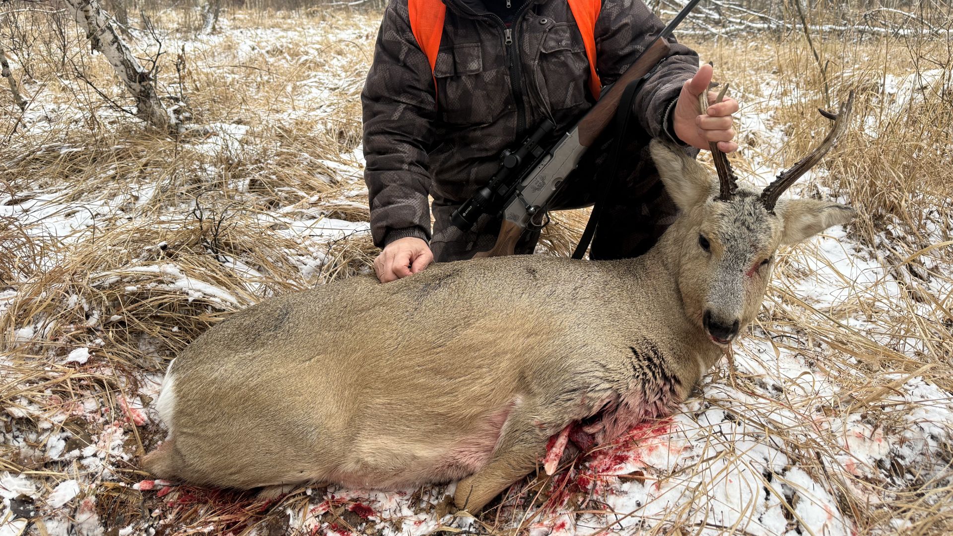 Охота загоном на сибирскую косулю декабрь 2025г. Добыт самец по лицензии в Курганской области.