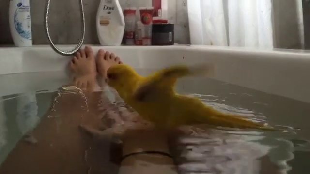 птичка купается с хозяйкой