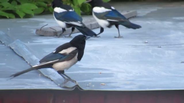 Сороки кормят своего птенца