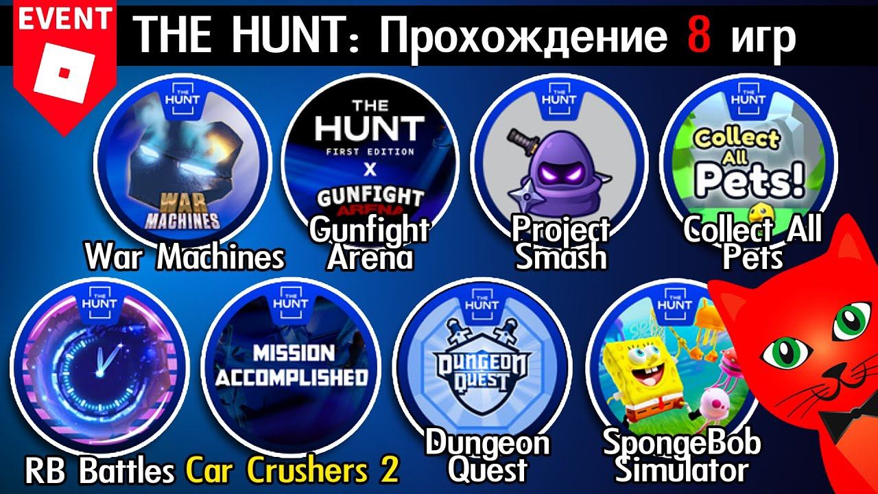 Стань крутым и получай эксклюзивные бонусы! Будь спонсором канала - https://www.youtube.com/channel/UC7jL8M3KBSO47ke9l1os_Fg/join Спасибо за Золотую кнопку YouTube (давайте соберем 3 000 000 подписчиков). Подписаться на канал (Subscribe to channel): https://www.youtube.com/channel/UC7jL8M3KBSO47ke9l1os_Fg?sub_confirmation=1 #роблокс, #roblox, #redcat Сегодня я покажу как получить БЕЙДЖ 34-41 в ивенте ОХОТА 2024 роблокс (The Hunt 2024 roblox). Прохожу игры: SpongeBob Simulator, Dungeon Quest, Car Crushers 2, RB Battles, Collect All Pets, Project Smash, Gunfight Arena, War Machines. Ивент - https://www.roblox.com/the-hunt Игра 1 - https://www.roblox.com/games/14696958202/2X-HUNT-SpongeBob-Simulator Игра 2 - https://www.roblox.com/games/2414851778/HUNT-Dungeon-Quest-RPG-Adventure Игра 3 - https://www.roblox.com/games/654732683/Rocket-UGC-Car-Crushers-2-Physics-Simulation Игра 4 - https://www.roblox.com/games/5036207802/THE-HUNT-RB-Battles-Minigames Игра 5 - https://www.roblox.com/games/8884433153/Collect-All-Pets Игра 6 - https://www.roblox.com/games/15092647980/UPD-Project-Smash ВИП (Project Smash) - https://www.roblox.com/share?code=bcbadbea8e57014cb61bd0d9e4d91b86&type=Server Игра 7 - https://www.roblox.com/games/14518422161/Gunfight-Arena-HUNT Игра 8 - https://www.roblox.com/games/12828227139/War-Machines ------------------------------------------------------- Второй канал (RED CAT GAMES) - https://www.youtube.com/channel/UCExXag432rjhB4pbLgVMD0A?sub_confirmation=1 Третий канал (Red Cat WOW) - https://www.youtube.com/@RedCatWOW Телеграм канал - t.me/redcat_official (@redcat_official) Cтраница канала в Инстаграме - https://www.instagram.com/redcatyoutube Сервер в DISCORD - https://discord.com/invite/redcatyoutube (redcatyoutube) Поддержать канал донатом: Все страны - https://donatepay.ru/don/redcat Украина - https://red-cat.diaka.ua/donate Мой профиль в РОБЛОКС (ник ORedCat) - https://www.roblox.com/users/531556867/profile Мой СЕРВЕР и МЕРЧ в Роблокс - https://www.roblox.com/groups/4046965/Red-Cat-Channel#!/store Моя игрушка в Роблокс (Красный кот) - https://www.roblox.com/catalog/13175970108/Red-Cat-Pal ------------------------------------------------------- Смотрите еще много всего интересного на канале Red Cat. Надеюсь вам понравится и вы останетесь. Не ходите по другим каналам, тут вас любят! Мяу