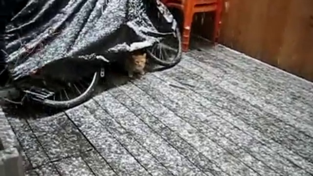 Кошка в испуге от снега!