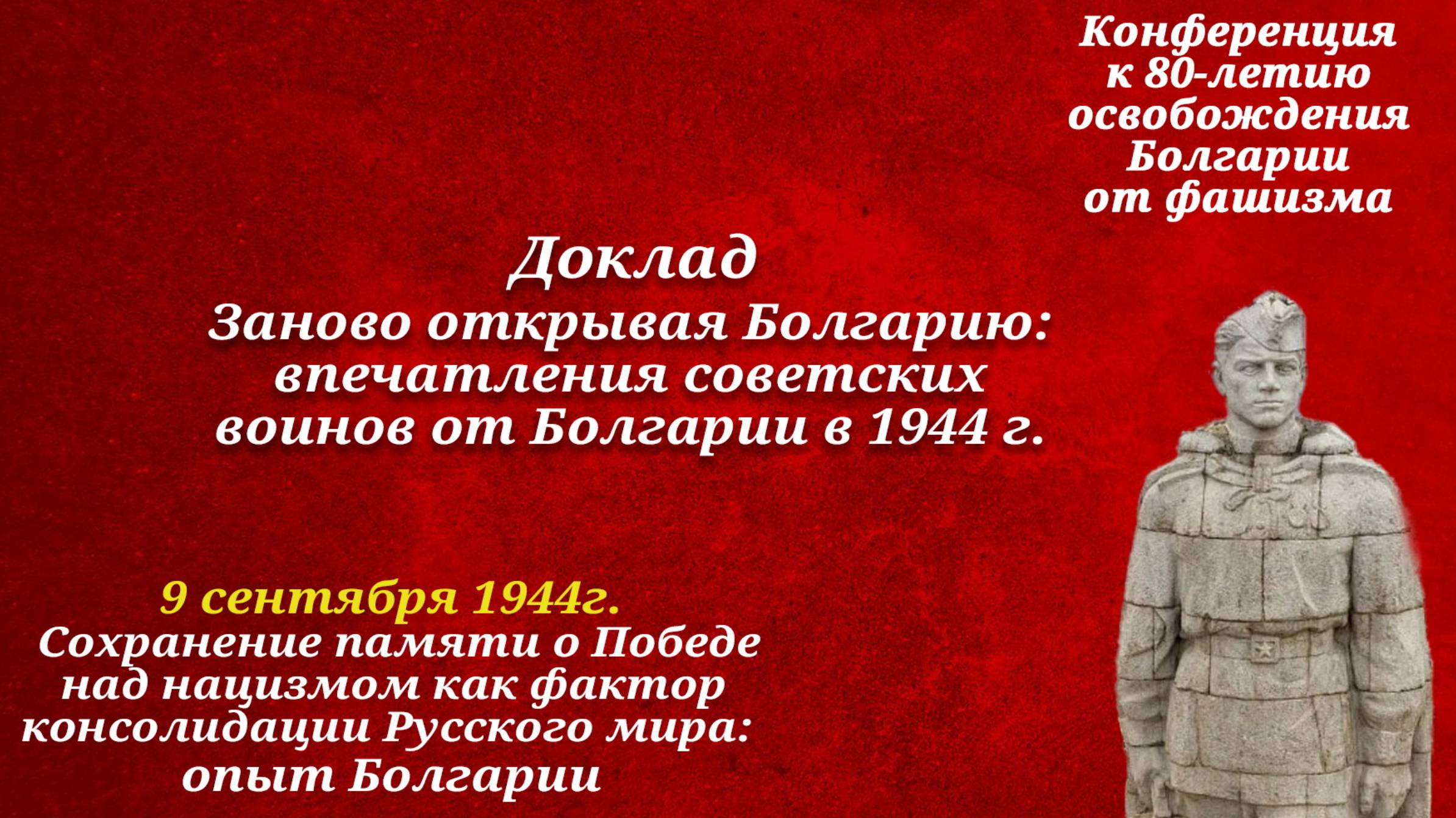 Конференция к 80-летию освобождения Болгарии от фашизма. 9 сентября 1944г. Сохранение памяти о Победе над нацизмом как фактор консолидации Русского мира: опыт Болгарии. В этом видео Доклад Никиты Гусева, кандидата исторических наук, ученого секретаря Института славяноведения РАН. Заново открывая Болгарию: впечатления советских воинов от Болгарии в 1944 г.