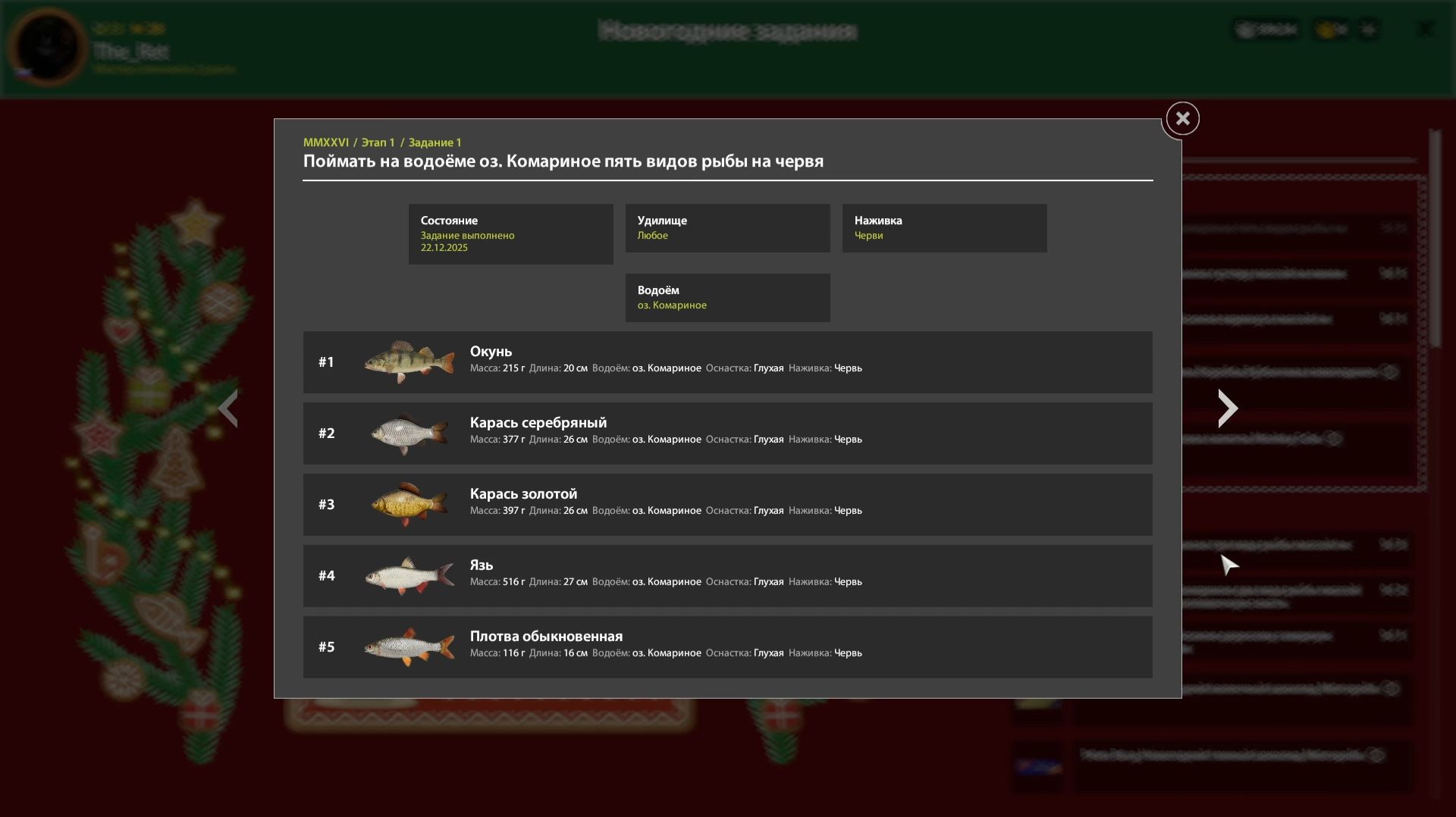Русская Рыбалка 4-Новогодние Задания 2026: поймать пять видов рыбы на червя оз. Комариное