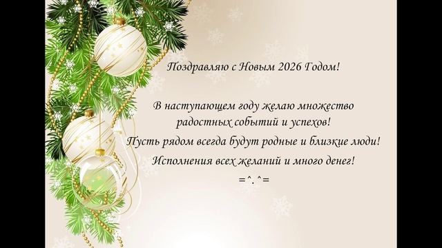 Поздравляю с Новым 2026 Годом! В наступающем году желаю множество радостных событий и успехов! Пусть рядом всегда будут родные и близкие люди! Исполнения всех желаний и много денег! =^.^=