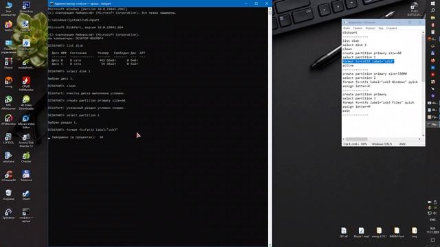 Установка Windows 10 на USB-3 флешку. 1. Первая часть: подготовка USB - Внимание это не загрузочна или установочная флешка, чтобы с неё устанавливать виндовс на SSD. Здесь показана полная установка полноценной виндовс именно на флешку и потом можно загружать компьютер именно с этой флешки и использовать виндовс по вашему усмотрению не используя жесткий диск или SSD даже если они вовсе не установлены в ПК ! Ваша виндовс будет у вас в кармане и будет работать на любом ПК в кторый вы установите флешку. Будем использовать флешку usb-3 на 64 гигабайта и разделим её на ТРИ раздела. Используем командную строку cmd.exe diskpart - - - - - - Посмотрим установленные диски - - - list disk select disk 1 clean - - - - - - Создадим не большей раздел на 60Mb для файлов загрузчика Windows - - - create partition primary size=60 select partition 1 format fs=Fat32 label="usb3" - - - отформатируем раздел в Fat32 - - - active - - - - - - Создадим раздел на 33 гигабайта под саму Windows - - - create partition primary size=33000 select partition 2 format fs=ntfs label="usb3 Windows" quick - - - отформатируем раздел в NTFS - - - assign letter=K - - - назначим букву раздела K - - - - - - - - - Создадим раздел под наши любые файлы размер указывать не обязательно он установится на всё оставшееся место на флешке - - - create partition primary select partition 3 format fs=ntfs label="usb3 Files" quick - - - отформатируем раздел в NTFS - - - assign letter=M - - - назначим букву раздела M - - - exit - - - - - - 2. Вторая часть: https://youtu.be/C8MCB3O8zzE
