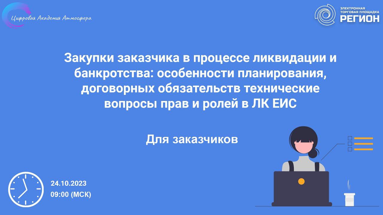 Подписывайтесь на нас в социальных сетях, чтобы не пропустить свежие новости: https://academy-atmosphere.ru/zakupki https://t.me/academy_atmosfera https://vk.com/academy_atmosfera https://rutube.ru/channel/24606397/ 00:00 Вступление 02:12 Приветствие спикера Маслову Елену Александровну 03:02 Закупки заказчика в процессе ликвидации и банкротства: особенности планирования, договорных обязательств технические вопросы прав и ролей в ЛК ЕИС 10:10 Банкротство 20:19 Очередность выплат. Вне очереди 21:47 Текущие платежи 23:10 Оспаривание сделок 28:41 Хозяйственная деятельность 30:30 «Дробление» сделки 32:24 Ограничения по сделкам. Фин. оздоровление 34:48 Ограничения по сделкам. Внешнее управление 36:10 Ликвидация 37:53 Ликвидация. Этапы 41:15 Определение Верховного Суда РФ 43:02 Субсидиарная ответственность 43:51 ЕИС 44ФЗ 44:42 ЕИС 223ФЗ 46:16 Ответы на вопросы участников