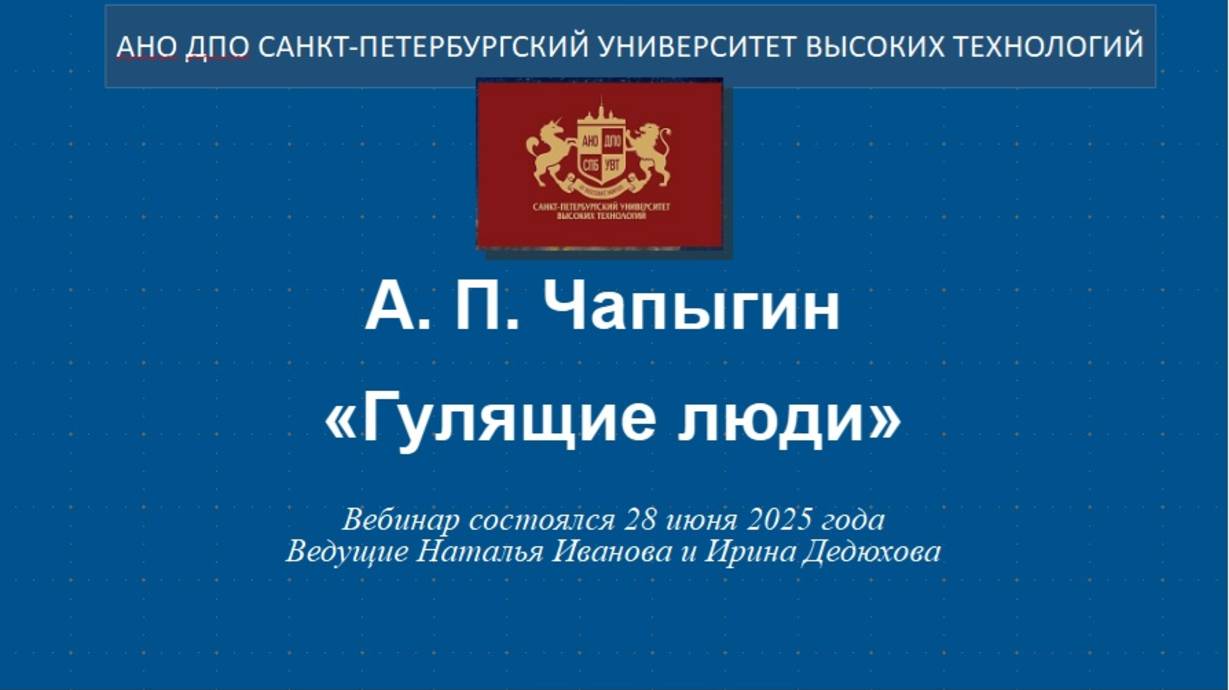 А. П. Чапыгин «Гулящие люди» (2025) Вебинар Книжной лавки на эту тему состоялся 28.06.2025 г. Ведущие Ирина Дедюхова и Наталья Иванова Смотреть/читать по теме: А. П. Чапыгин «Гулящие люди» https://ogurcova-portal.com/a-p-chapygin-gulyashhie-lyudi/ Источники: Научно-технический портал «Технарь» https://ogurcova-online.com/ "Книжная лавка" https://ogurcova-portal.com/ "Литературное обозрение" https://litobozrenie.com/ Вебинар разработан и проведен в рамках образовательных программ АНО ДПО СПБ УВТ - Санкт-Петербургский университет высоких технологий https://univer.spb.ru/ в соответствии с законодательством об образовательной деятельности в РФ N 273-ФЗ по лицензии №3911 Комитета по образованию Правительства СПб https://univer.spb.ru/wp-content/uploads/2019/12/license015small-1.jpg