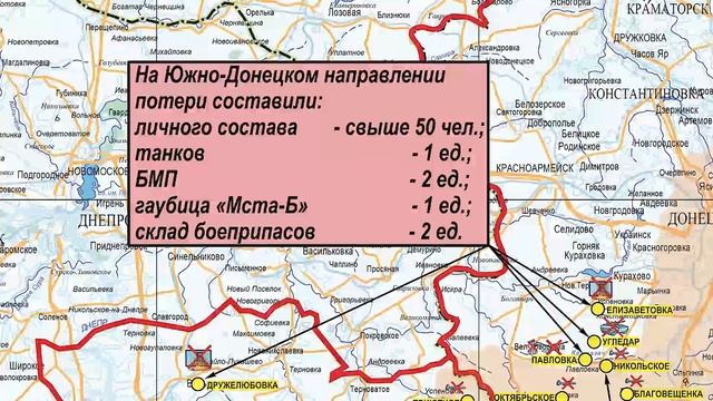 Вооруженные Силы Российской Федерации продолжают проведение специальной военной операции. ◽️ На Купянском направлении ударами оперативно-тактической и армейской авиации, огнем артиллерии и действиями штурмовых групп «Западной» группировки войск поражены подразделения 14-й и 92-й механизированных бригад ВСУ в районах населенных пунктов Гряниковка, Двуречная, Першотравневое, Тимковка, Масютовка и Крахмальное Харьковской области. ? Уничтожено до 80-ти украинских военнослужащих, шесть автомобилей и одна гаубица Д-20. ◽️ На Красно-Лиманском направлении штурмовой и армейской авиацией, артиллерией и тяжелыми огнеметными системами группировки войск «Центр» нанесено поражение подразделениям ВСУ в районах населенных пунктов Торское, Ямполовка Донецкой Народной Республики, Стельмаховка, Невское, Червонопоповка и Червоная Диброва Луганской Народной Республики, а также Серебрянского лесничества. ? За сутки на данном направлении уничтожено до 100 украинских военнослужащих, боевая машина пехоты, пять боевых бронированных машин и самоходная гаубица «Акация». ◽️ На Донецком направлении в результате ударов авиации и огня артиллерии «Южной» группировки войск, за сутки уничтожено свыше 250-ти украинских военнослужащих, боевая машина пехоты, четыре автомобиля, две артиллерийские системы М777 производства США, самоходная гаубица М109 «Paladin» производства США, самоходная гаубица «Акация», буксируемая пушка «Гиацинт» и две противотанковые пушки «Рапира». ? Также в районе населенного пункта Белогоровка Луганской Народной Республики уничтожен склад боеприпасов. ◽️ На Южно-Донецком направлении оперативно-тактической авиацией и артиллерией группировки войск «Восток» нанесено комплексное огневое поражение подразделениям ВСУ в районах населенных пунктов Павловка и Угледар Донецкой Народной Республики. ? Потери противника на данном направлении за сутки составили свыше 50-ти украинских военнослужащих, один танк, две боевые машины пехоты и гаубица «Мста-Б». ? В районах населенных пунктов Елизаветовка Донецкой Народной Республики и Дружелюбовка Запорожской области уничтожены два склада боеприпасов ВСУ. ◽️ На Херсонском направлении в ходе контрбатарейной борьбы за сутки уничтожены: самоходная гаубица «Гвоздика», самоходная гаубица «Акация» и в районе населенного пункта Куйбышево Херсонской области радиолокационная станция контрбатарейной борьбы производства США AN/TPQ-50. ? Оперативно-тактической и армейской авиацией, ракетными войсками и артиллерией группировок войск (сил) Вооруженных Сил Российской Федерации за сутки нанесено поражение 78-ми артиллерийским подразделениям ВСУ на огневых позициях, живой силе и военной технике в 119-ти районах. ? В районе населенного пункта Красный Лиман Донецкой Народной Республики уничтожен украинский зенитный ракетный комплекс «Оса-АКМ». ? В результате высокоточного ракетного удара ВКС России в городе Харьков поражены цеха сборки бронетанковой техники ВСУ на территории машиностроительного «Завода им. Малышева». ? Средствами противовоздушной обороны за сутки уничтожены 17 украинских беспилотных летательных аппаратов в районах населенных пунктов Фомовка, Владимировка, Полтава, Голиково Пшеничное, Коломыйчиха, Нижняя Дуванка, Лисичанск Луганской Народной Республики, Октябрьское, Никольское, 