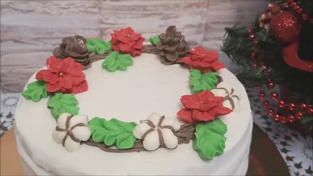 Апельсиновый торт. Разрез.Украшение торта масляным кремом Рождественский цветок,хлопок,шишка