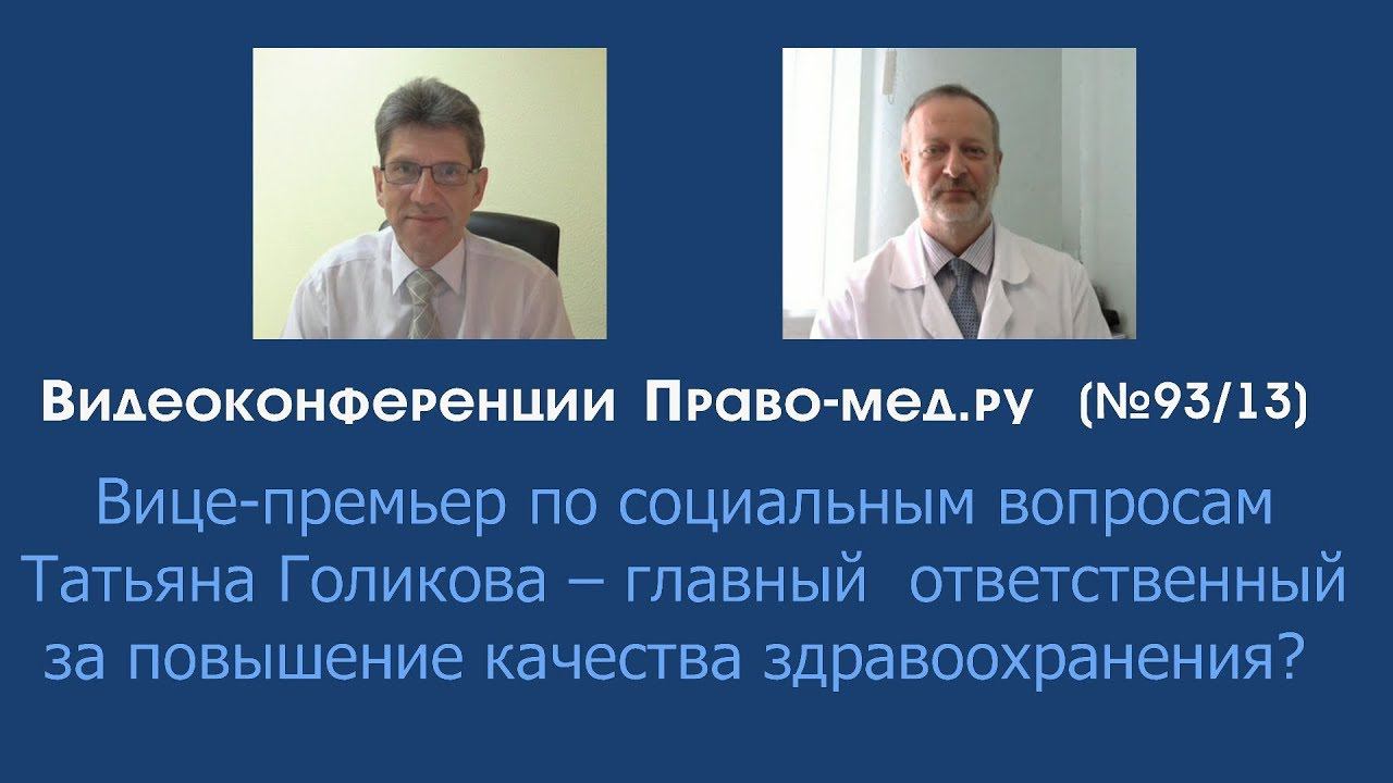 Видеоконференция Право-мед.ру № 93 (13) от 10 мая 2018 года, на которой обсуждалось предложение Д. Медведева назначить Т. Голикову вице-премьером по социальным вопросам и здравоохранению Тема: Вице-премьер по социальным вопросам Татьяна Голикова – главный ответственный за повышение качества здравоохранения? Рассмотренные вопросы 1. Причины назначения на должность 2. Что изменится в стиле (подходах) при реализации государственной политики в сфере здравоохранения? 3. Сможет ли новый вице-премьер обеспечить новое качество российского здравоохранения? Участники: Панов Алексей Валентинович, главный редактор информационного портала Право-мед.ру, г. Омск , член АЮР Степанов Игорь Олегович, врач - невролог, юрист, председатель Ярославской областной общественной организации инвалидов-больных рассеянным склерозом "Гефест", г. Ярославль, член АЮР