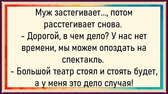 Как тёще на трассе заехали не туда! Сборник свежих анекдотов! Юмор! 00:00:00 Пьяный в автобусе • Пьяный мужчина втискивается в переполненный автобус. • Пассажиры возмущаются, но он объясняет, что не может ездить в пустом автобусе. 00:00:19 Ошибка в магазине • Мужчина просит продавца купить «красную задницу», но продавец объясняет, что это сердце. • Мужчина настаивает на своём, утверждая, что знает, как выглядит сердце. 00:00:39 Визит к врачу • Мужчина приходит к врачу и жалуется на красный цвет кожи. • Врач объясняет, что кожа покрыта губной помадой. 00:00:54 Страусы • Существуют два вида страусов: серые и голубые. • Серые прячут голову в грунт, а голубые ждут этого. 00:01:06 Возвращение мужа • Муж возвращается домой в тяжёлом состоянии. • Жена спрашивает, как он может смотреть ей в лицо, на что он отвечает, что ко всему можно привыкнуть. 00:01:21 Встреча с налоговой • В фирму заходит маленький мужичок в пиджачке, шляпе и портфеле. • Управляющий приветствует его, но мужичок отвечает, что он из налоговой. 00:01:34 Размышления о женитьбе • На старости лет Наедин задумывается о женитьбе. • Приятель укоряет его, говоря, что нужно думать о загробной жизни, но Наедин отвечает, что зимой нужен огонь больше всего. 00:01:53 Криминальное сообщение • В эфире сообщают о нападении на мужчину. • Просят позвонить по указанному телефону, если кто-то знает нападавших. 00:02:14 Веселье на физфаке • На физфаке все радуются, что деканат из окна выпал. • Один студент плачет, потому что не видел этого. 00:02:31 Обучение в туалете • Мама спрашивает сына, почему он сидит в туалете с телефоном. • Сын отвечает, что учится справляться с жизненными трудностями в TikTok. 00:02:45 Горячий бифштекс • В ресторане официант пытается остудить горячий бифштекс, но он всё время улетает. 00:03:05 Новые русские • Два новых русских обсуждают неудобную ситуацию с заказом Версаче. 00:14:04 Соревнования лыжников • Лыжник под номером тринадцать пришёл к финишу первым. • Вторым к финишу пришёл медведь. • Поиски остальных лыжников продолжаются. 00:14:18 Покраска ракеты • Рядовой Петров не смог покрасить ракету и закинул ведро с краской на нос ракеты. • Министр обороны спросил Петрова, что это такое, указывая на ведро. • Петров ответил, что это синхрофазотрон. 00:14:45 Размышления о службе • До службы спал спокойно, знал, что охраняют. • Во время службы спал плохо, охраняли. • После службы вообще не сплю, знаю, кто охраняет. 00:14:57 Покупки в магазине • Девушка покупает одну зубную щётку, один йогурт и один банан. • Продавец спрашивает, наверное, одна живёте? • Девушка удивляется, как продавец догадался. 00:15:12 Родственные отношения • Расселина перестал высылать деньги родственнику в Сицилии из-за рождения сына. • Родственник возмущён, что Расселина хочет воспитывать сына на его деньги. 00:15:34 Советы доктора • Доктор советует бросить пить, курить и встречаться с женщинами. • Пациент удивляется, что может продолжать бриться. 00:15:45 Подготовка к балету • Жена просит мужа застегнуть молнию на платье. • Муж застёгивает и расстёгивает молнию, жена беспокоится о времени. 00:16:07 Сигара на тумбочке • Муж возвращается из командировки и видит сигару на тумбочке. • Жена молчит, муж спрашивает, откуда сигара. • Из шкафа доносится ответ: «Да из Гаваны, из Гаваны». 00:16:40 Пробуждение после гулянки • Пробуждение после крутой гулянки, мутные рассуждения. • Воп