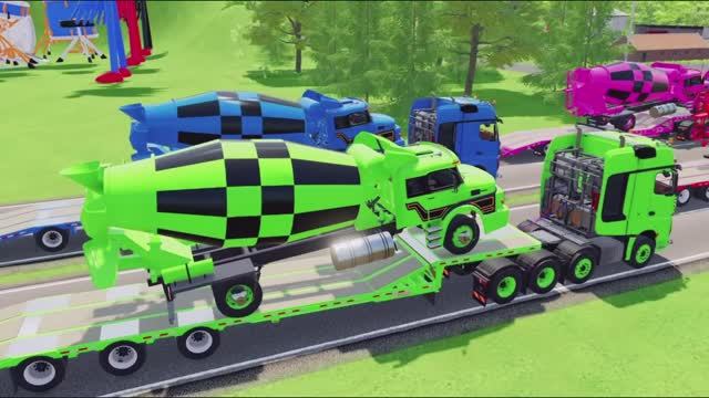 Разноцветные грузовички грузят бетономешалки и везут их в гараж. Яркий мультик для малышей.