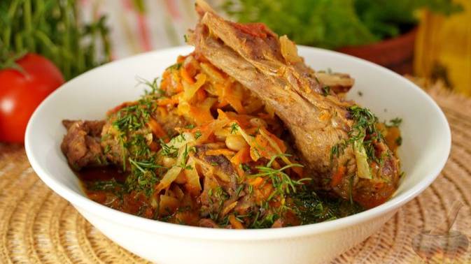 Сытная компания в одной тарелке. СВИНЫЕ РЁБРА С КАПУСТОЙ, ФАСОЛЬЮ И ПОМИДОРАМИ