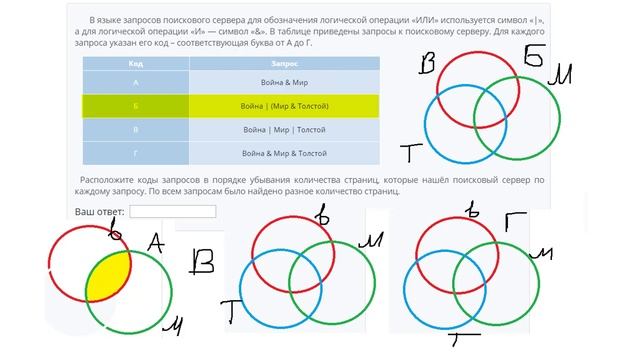 http://egoroffartem.pythonanywhere.com/oge/task/18 На сайте размещены другие задания по этой теме http://egoroffartem.pythonanywhere.com/oge/videotask/18 Список всех разборов 18 задания из ОГЭ по информатике: https://www.egoroffartem.ru/oge/videotask/ Видео решения задач по ОГЭ информатике https://vk.com/egoroff_channel_oge В данном группе можете найти информацию о новых видео и задать вопросы по ОГЭ Информатике Разбор задания № 18 ОГЭ ИНФОРМАТИКА Тема задачи "Поисковые запросы в Интернете" В языке запросов поискового сервера для обозначения логической операции «ИЛИ» используется символ «|», а для логической операции «И» — символ «&». В таблице приведены запросы к поисковому серверу. Для каждого запроса указан его код – соответствующая буква от А до Г. Код Запрос А Война & Мир Б Война | (Мир & Толстой) В Война | Мир | Толстой Г Война & Мир & Толстой Расположите коды запросов в порядке убывания количества страниц, которые нашёл поисковый сервер по каждому запросу. По всем запросам было найдено разное количество страниц.