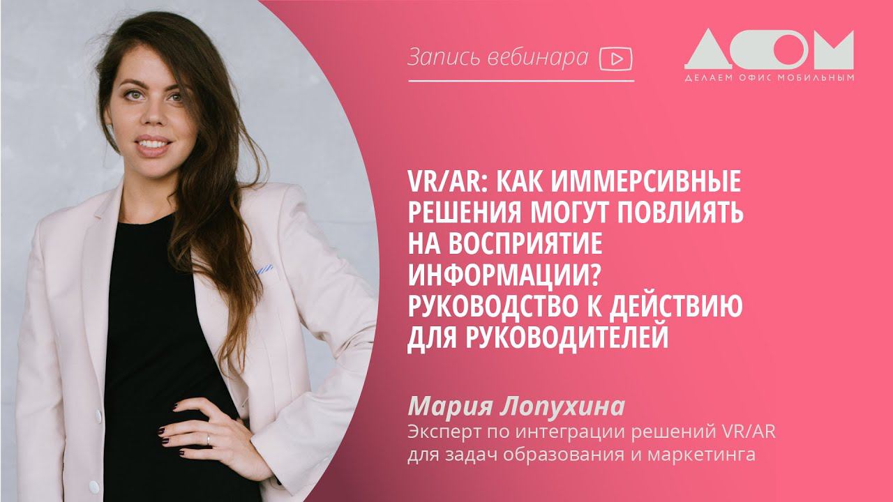 00:00 - Видеоролик о VR тренажерах МГУУ Правительства Москвы 00:47 - Вступление. Приветственное слово 05:18 - О спикере и совместной работе с МГУУ 08:50 - План вебинара 10:10 - Ликбез по VR и AR 13:18 - VR. Манера повествования 16:35 - Монтаж для кино 360 18:30 - Демонстрация и обсуждение видео Resonance: A jump VR video 21:01 - Демонстрация и обсуждение Notes on Blindness 23:19 - Выводы исследования компании Modum Lab по эмпатии 28:49 - Манера повествования в AR 30:50 - Реализованные проекты 34:30 - Что изменилось сейчас? Режим самоизоляции 39:46 - Решение возникающих проблем во время режима самоизоляции 40:00 - Кейс от Modum Lab. Виртуальные экскурсии по офису 43:14 - Виртуальные переговорные 46:00 - Трансляции. Стерео 180 49:03 - Дополненная реальность. Опыт Ростелекома 50:57 - Что изменилось сейчас? Размещение услуг, марктеинг 54:40 - VR шоурум 59:04 - Оживающие этикетки 1:01:01 - Вопрос к аудитории. Какие задачи стоят перед вами? 1:04:08 - График роста подключения к платформа Steam 1:06:00 - Подведение итогов 1:10:56 - Ответы на вопросы аудитории Вместе с экспертом по интеграции решений VR/AR для задач образования и маркетинга Марией Лопухиной разбираемся с тем, какие возможности дают иммерсивные технологии для эффективной цифровой трансформации организации.