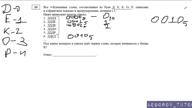 Разбор задания № 10 Демо варианта 2018 по ЕГЭ ИНФОРМАТИКА Тема задачи "Кодирование, комбинаторика" Добавляйтесь в группу https://vk.com/aegorov_tutor Предложить задачу для разбора https://vk.com/topic-116207750_38371445 Задать вопрос по задаче из ЕГЭ https://vk.com/topic-116207750_37402901