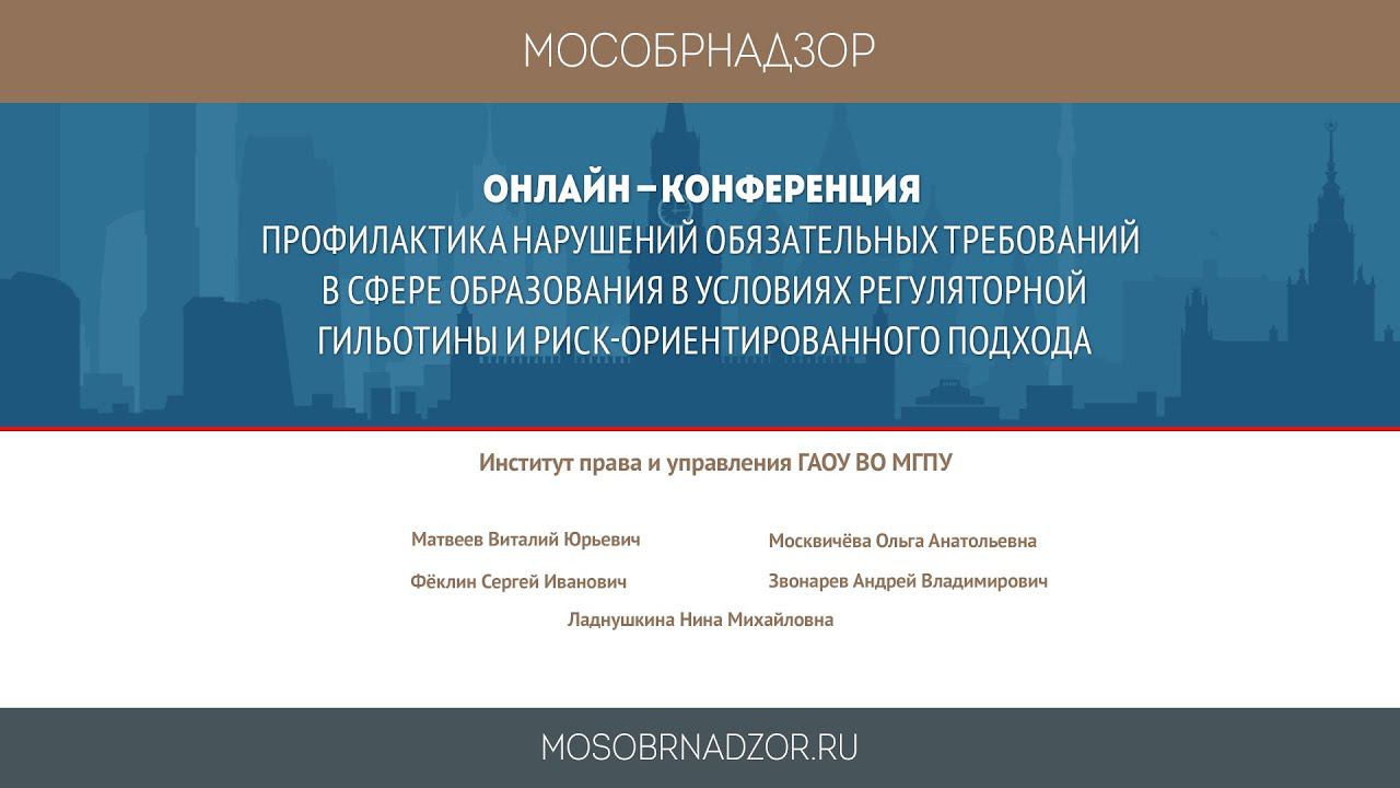 Онлайн-конференция «Профилактика нарушений обязательных требований в сфере образования в условиях регуляторной гильотины и риск-ориентированного подхода» был проведен в рамках проекта Мособрнадзор.РФ 28 апреля 2020 года. В конференции приняли участие Москвичёва О.А., Звонарёв А.В., Феклин С.И., Матвеев В.Ю., Ладнушкина Н.М. Страница конференции на сайте проекта мособрнадзор: http://mosobrnadzor.ru/supervision/webinars/2020-04-28_10-00