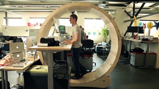 Вот такое гигантское беличье колесо создали два художника - Робб Годшоу и Уилл Доенлен. Предназначено оно для офисных работников. Конструкция сделана из фанеры, колёсиков от скейтборда, нескольких труб и 240 шурупов. Кстати, на постройку ушло всего 24 часа.
