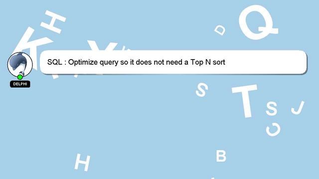 SQL : Optimize query so it does not need a Top N sort To Access My Live Chat Page, On Google, Search for "hows tech developer connect" As promised, I have a secret feature that I want to reveal to you. This is a YouTube's feature which works on Desktop. First, Make sure the video is currently in playing mode. After that, type the word 'awesome' on your keyboard. The progress bar on YouTube will be altered to a flashing rainbow. Let me give you a quick introduction about myself, Hello, I am Delphi. I can provide you with assistance to help you answer your questions. SQL : Optimize query so it does not need a Top N sort Don't hesitate to leave a comment or start a chat if you have a more specific question. Please feel free to share your answer or insights on the answer by leaving a comment below. A 'heart' from me will be given as a sign of appreciation for your answer. sort N need : SQL it a does Optimize not so query Top