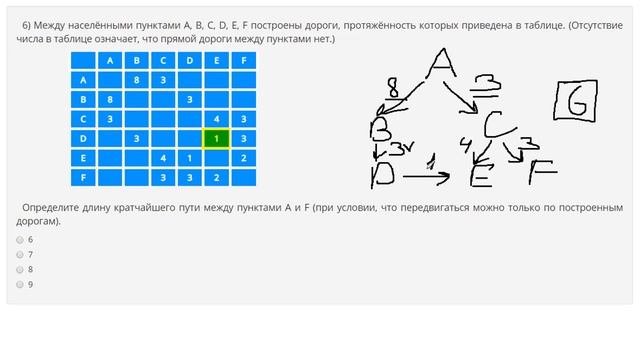 https://www.egoroffartem.ru/oge/task/3 На сайте размещены другие задания по этой теме https://www.egoroffartem.ru/oge/videotask/3 Список всех разборов 3 задания из ОГЭ по информатике: https://www.egoroffartem.ru/oge/videotask/ Видео решения задач по ОГЭ информатике https://vk.com/egoroff_channel_oge В данном группе можете найти информацию о новых видео и задать вопросы по ОГЭ Информатике Разбор задания № 3 ОГЭ ИНФОРМАТИКА Тема задачи "Кратчайший путь в графе" Между населёнными пунктами A, B, C, D, E, F построены дороги, протяжённость которых приведена в таблице. (Отсутствие числа в таблице означает, что прямой дороги между пунктами нет.) Определите длину кратчайшего пути между пунктами A и F (при условии, что передвигаться можно только по построенным дорогам).