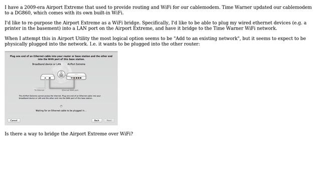 Apple: How to use 2009-era Airport Extreme in Bridge Mode Wifi? Helpful? Please support me on Patreon: https://www.patreon.com/roelvandepaar With thanks & praise to God, and with thanks to the many people who have made this project possible! | Content (except music & images) licensed under CC BY-SA https://meta.stackexchange.com/help/licensing | Music: https://www.bensound.com/licensing | Images: https://stocksnap.io/license & others | With thanks to user Steve Chambers (apple.stackexchange.com/users/33273), user Fyrefly (apple.stackexchange.com/users/83415), user Caffeine Coma (apple.stackexchange.com/users/4595), and the Stack Exchange Network (apple.stackexchange.com/questions/118152). Trademarks are property of their respective owners. Disclaimer: All information is provided "AS IS" without warranty of any kind. You are responsible for your own actions. Please contact me if anything is amiss at Roel D.OT VandePaar A.T gmail.com