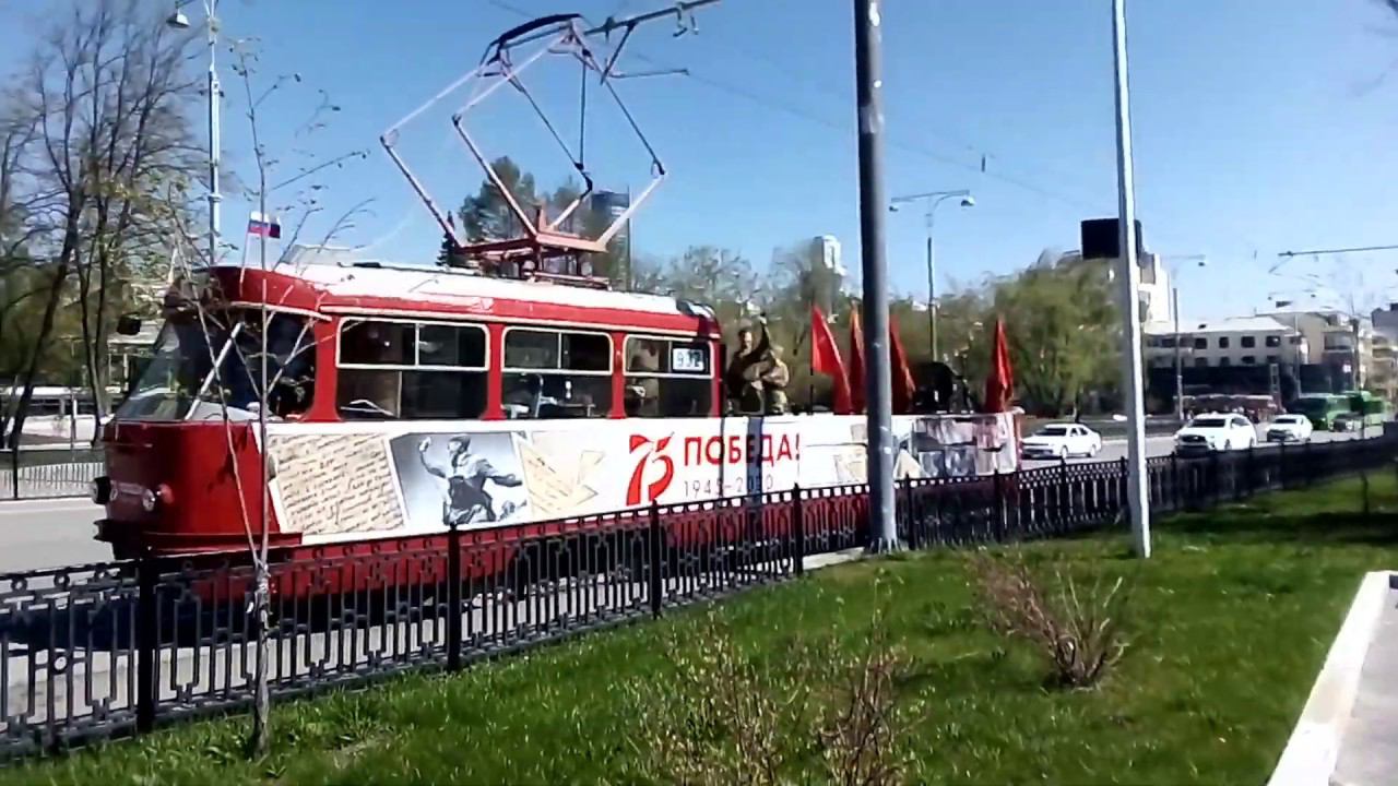 Этот красочный и интересный трамвай ездил 9 мая. Этот вагон украшен в символике праздника победы. На грузовой платформе расположились актёры переодетые в военную форму, а также там находятся пулеметы и флаг советского союза. Вагон можно было увидеть на ВИЗе, Вторчермете, ЦПКиО.