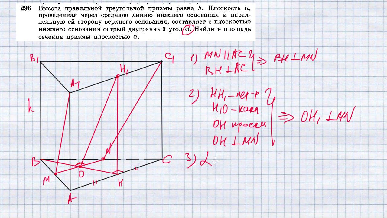 296. Высота правильной треугольной призмы равна h. Плоскость α, проведенная через среднюю линию