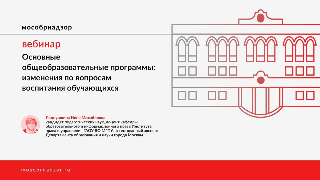 Вебинар «Основные общеобразовательные программы: изменения по вопросам воспитания обучающихся» был проведен в рамках проекта Мособрнадзор.РФ 9 февраля 2021 года. Ведущая вебинара - Ладнушкина Н.М. Страница вебинара на сайте проекта - http://mosobrnadzor.ru/prevention/webinars/2021-02-09_16-00