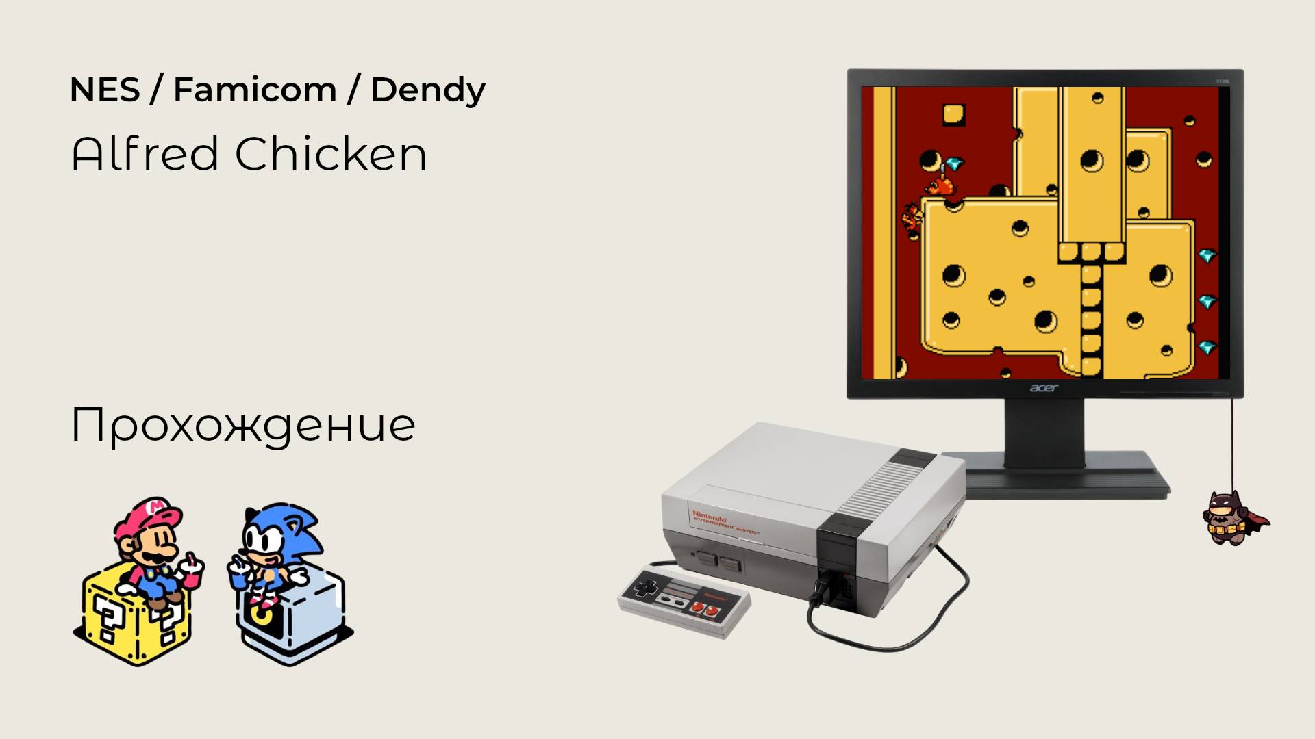 Alfred Chicken - веселая игрушка про цыпленка, не умеющего летать, но хорошо прыгающего. Цель - собрать все алмазы на уровне, не замарав лапы о немногочисленных, но надоедливых врагов. Музыка и графика на 5, хотя сам игровой процесс немного однообразен. Заходите на наш сайт: https://consolgame.ru #nes #retrogames #nintendo #dendy #consolgame #прохождение