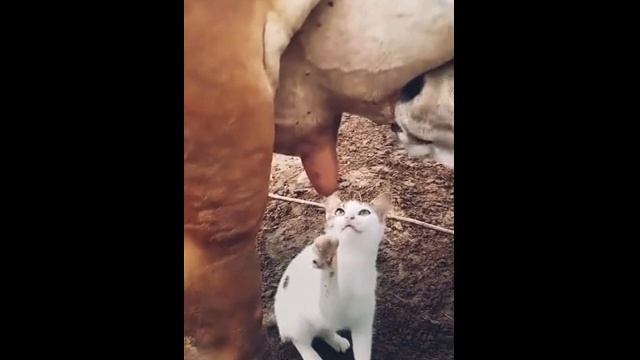 Кошка хочет молока из коровы