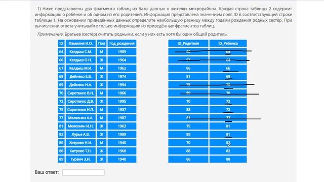 http://egoroffartem.pythonanywhere.com/ege/task/4 На сайте размещены другие задания по этой теме http://egoroffartem.pythonanywhere.com/ege/videotask/4 Список всех разборов 4 задания из ЕГЭ по информатике: https://www.egoroffartem.ru/ege/videotask/ Видео решения задач по ЕГЭ информатике https://vk.com/egoroff_channel В данном группе можете найти информацию о новых видео и задать вопросы по ЕГЭ Информатике ЕГЭ Информатика Демоверсия 2019 Ниже представлены два фрагмента таблиц из базы данных о жителях микрорайона. Каждая строка таблицы 2 содержит информацию о ребёнке и об одном из его родителей. Информация представлена значением поля ID в соответствующей строке таблицы 1. На основании приведённых данных определите наибольшую разницу между годами рождения родных сестёр. При вычислении ответа учитывайте только информацию из приведённых фрагментов таблиц. Примечание. Братьев (сестёр) считать родными, если у них есть хотя бы один общий родитель