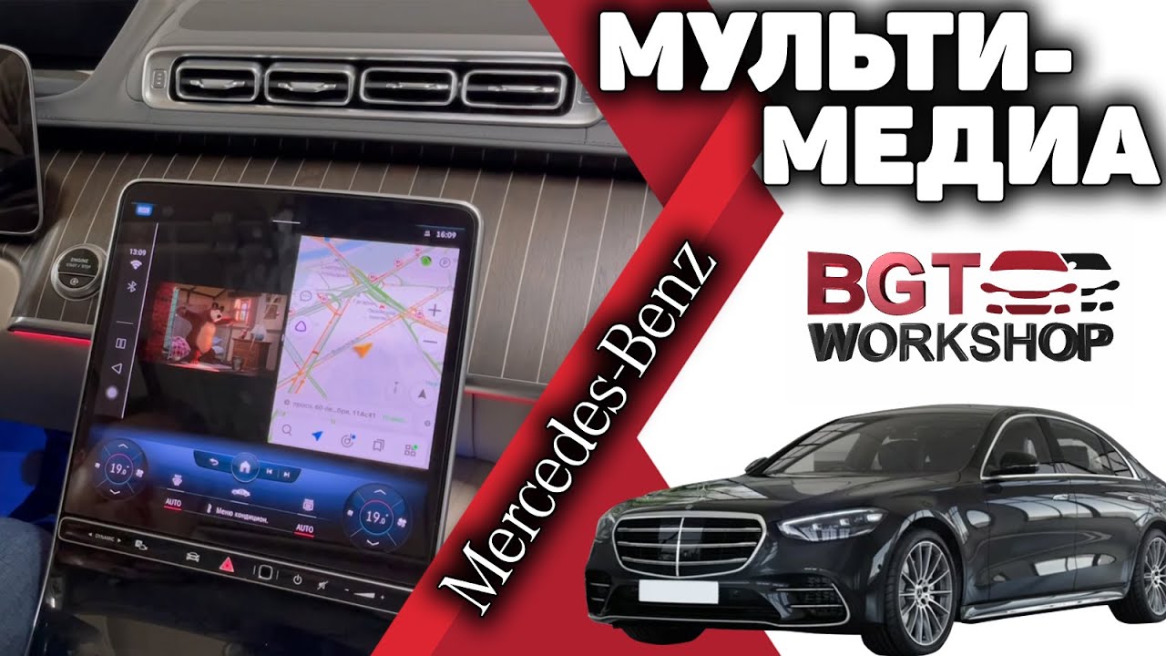 На самый свежий Мерседес S-Class W223 ставим различные дополнительные системы и устройства! На 2-а задних монитора подключили Apple TV и теперь пассажиры смогут смотреть весь контент с самого Эппл ТВ + всё, что есть в айфоне будет выводиться на оба задних монитора! На монитор перед водителем установили дополнительную навигационно-мультимедийную систему! Любые приложения без ограничений будут на большой мониторе установить с гарантией на срок владения авто в http://bgtworkshop.ru