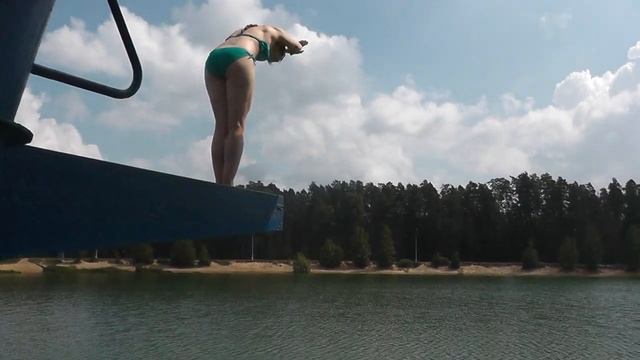 Купальщица прыгает с высокого выступа в воду реки.