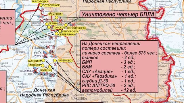 Специальная Военная Операция России на территории Украины Сводки, карты, обстановка на фронте: https://vk.com/newzov ----------------------- ? Вечером 28 апреля Вооруженными Силами Российской Федерации нанесен групповой удар высокоточным оружием большой дальности морского базирования по месту нахождения командного состава объединенной группировки войск ВСУ «Херсон». ❕ Цель удара достигнута. ? На Купянском направлении ударами оперативно-тактической и армейской авиации, огнем артиллерии «Западной» группировки войск поражены подразделения противника в районах населенных пунктов Каменка, Кисловка Харьковской области и Стельмаховка Луганской народной республики. ◽️ В районах населенных пунктов Артемовка, Тимковка, Синьковка и Котляровка пресечены действия четырех украинских диверсионно-разведывательных групп. ◽️ Потери противника составили более 70-ти украинских военнослужащих, пять боевых бронированных машин, автомобиль с боеприпасами, два пикапа, а также одна гаубица Д-20. ? На Красно-Лиманском направлении ударами оперативно-тактической авиации и огнем артиллерии группировки войск «Центр» нанесено поражение подразделениям противника в районах населенных пунктов Островское Луганской народной республики, Терны, Торское, Серебрянка и Григоровка Донецкой народной республики. ◽️ Уничтожено до 75-ти украинских военнослужащих, две боевые бронированные машины, три автомобиля, а также две гаубицы Д-20 и Д-30. ? На Донецком направлении штурмовые отряды продолжали активные действия по уничтожению противника на западных окраинах города Артемовск. Подразделения воздушно-десантных войск оказывали поддержку штурмовым отрядам с флангов. ◽️ Ударами оперативно-тактической и армейской авиации, огнем артиллерии и тяжелых огнеметных систем «Южной» группировки войск пресечены попытки противника контратаковать из районов населенных пунктов Часов Яр, Калинина и Красное Донецкой народной республики. ◽️ За прошедшие сутки в данном районе авиацией совершено семь самолетовылетов. Артиллерией «Южной» группировки войск выполнено 58 огневых задач. ◽️ Общие потери противника на данном направлении составили более 575-ти украинских военнослужащих и наемников, два танка, три боевые машины пехоты, две боевые бронированные машины, двенадцать автомобилей, две самоходные артиллерийские установки «Акация» и «Гвоздика», одна гаубица Д-30, а также две радиолокационные станции контрбатарейной борьбы производства США AN/TPQ-50. ? На Южно-Донецком и Запорожском направлениях ударами авиации и огнем артиллерии группировки войск «Восток» нанесено поражение подразделениям ВСУ в районах населенных пунктов Угледар, Новополь и Успеновка Донецкой народной республики. ◽️ В районе населенного пункта Новомайорское Донецкой народной республики пресечены действия украинской диверсионно-разведывательной группы. ◽️ За сутки потери противника составили свыше 85-ти украинских военнослужащих, один танк, две боевые бронированные машины, три пикапа, а также две гаубицы Д-20 и Д-30. ◽️ Кроме того, в районе населенных пунктов Шахтерское и Успеновка Донецкой народной республики уничтожены склады боеприпасов 72-й механизированной бригады ВСУ и 110-й бригады территориальной обороны. ? На Херсонском направлении в результате огневого поражения за сутки уничтожено до 20-ти украински